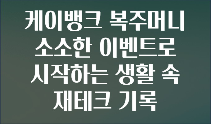 🤔 생활 속 재테크, 케이뱅크 복주머니 이벤트로 시작해볼까요?“작은 습관이 큰 재테크로!”라는 말, 들어보셨나요? 💸 요즘처럼 불확실한 경제 상황에선 일상에서 꾸준히 재테크를 실천하는 게 무엇보다 중요해요. 그런데 저축이나 투자, 복잡한 금융상품에 막막함을 느끼시는 분들 많으시죠? 그래서 오늘은 📌 소소한 이벤트 참여만으로 시작할 수 있는 케이뱅크의 ‘복주머니 이벤트’를 활용해 생활 속 돈 관리 꿀팁을 소개하려고 해요! ✨케이뱅크가 준비한 재미있고 실용적인 금융 이벤트와 함께, 작은 금액부터 차근차근 돈을 모으고 관리하는 ‘생활 밀착형 재테크 기술’을 쉽고 친근하게 배워보실게요. 💡 여러분도 충분히 가능한 ‘한 발짝 재테크 도전기’! 바로 시작해볼까요? 🚀🌟 케이뱅크 ‘복주머니 이벤트’란 무엇..